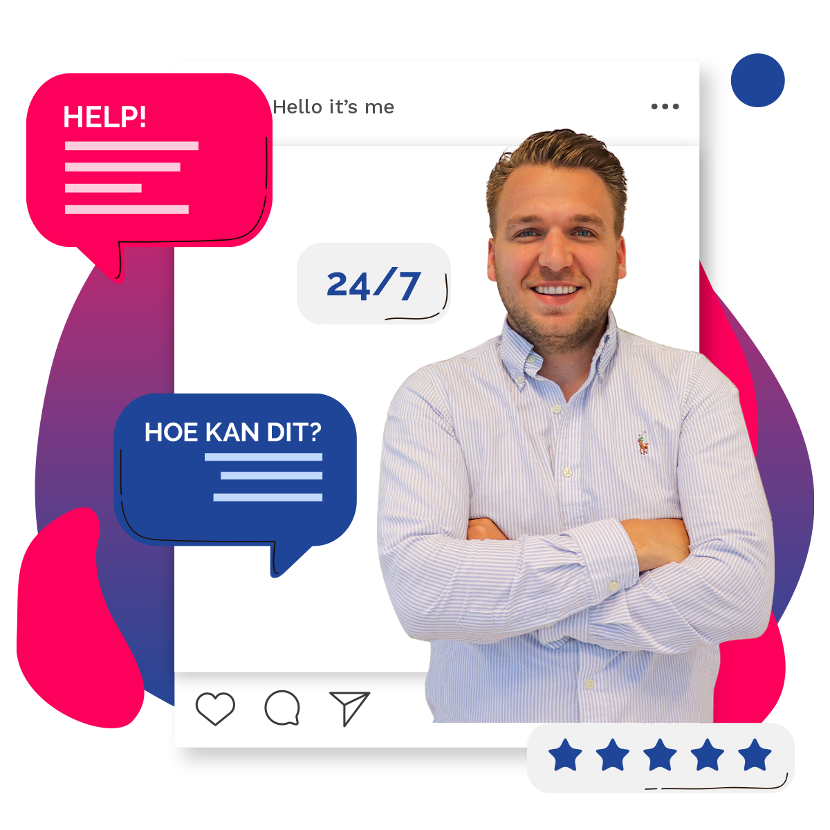 Een gebruiksvriendelijke, goed vindbare en renderende website met een mooie uitstraling is de basis voor een succesvolle onderneming. Wij zijn jouw deskundige en betrokken partner bij het realiseren van een website met een professionele digitale infrastructuur, die eenvoudig te onderhouden is en meetbaar resultaat oplevert. Hello itβs me zorgt er ook voor dat je alles uit Facebook, Instagram en LinkedIn haalt, met een social-mediamarketingstrategie die oplevert.