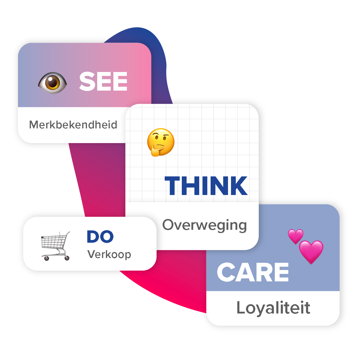See (bekendheid) is de grootst mogelijke doelgroep. Think (overweging) is de doelgroep met interesse. Do (aankoop) is de doelgroep met koopintentie, terwijl Care (loyaliteit) de bestaande klanten zijn. Het marketingkanaal en de boodschap kunnen hierop worden aangepast. Als de bezoeker in de juiste lade wordt geplaatst, is de kans op het behalen van het uiteindelijke doel groter.