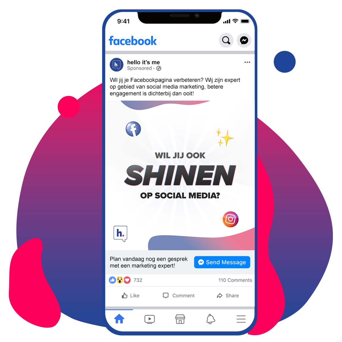 Hello it’s me zorgt voor uitstekende social media marketing en een strategie die rendeert. Jouw specifieke doelstellingen worden vertaalt naar concrete social media targets. Denk aan een verhoging van de omzet, een hogere klanttevredenheid, het genereren van leads of een betere zichtbaarheid en naamsbekendheid binnen je doelgroep.